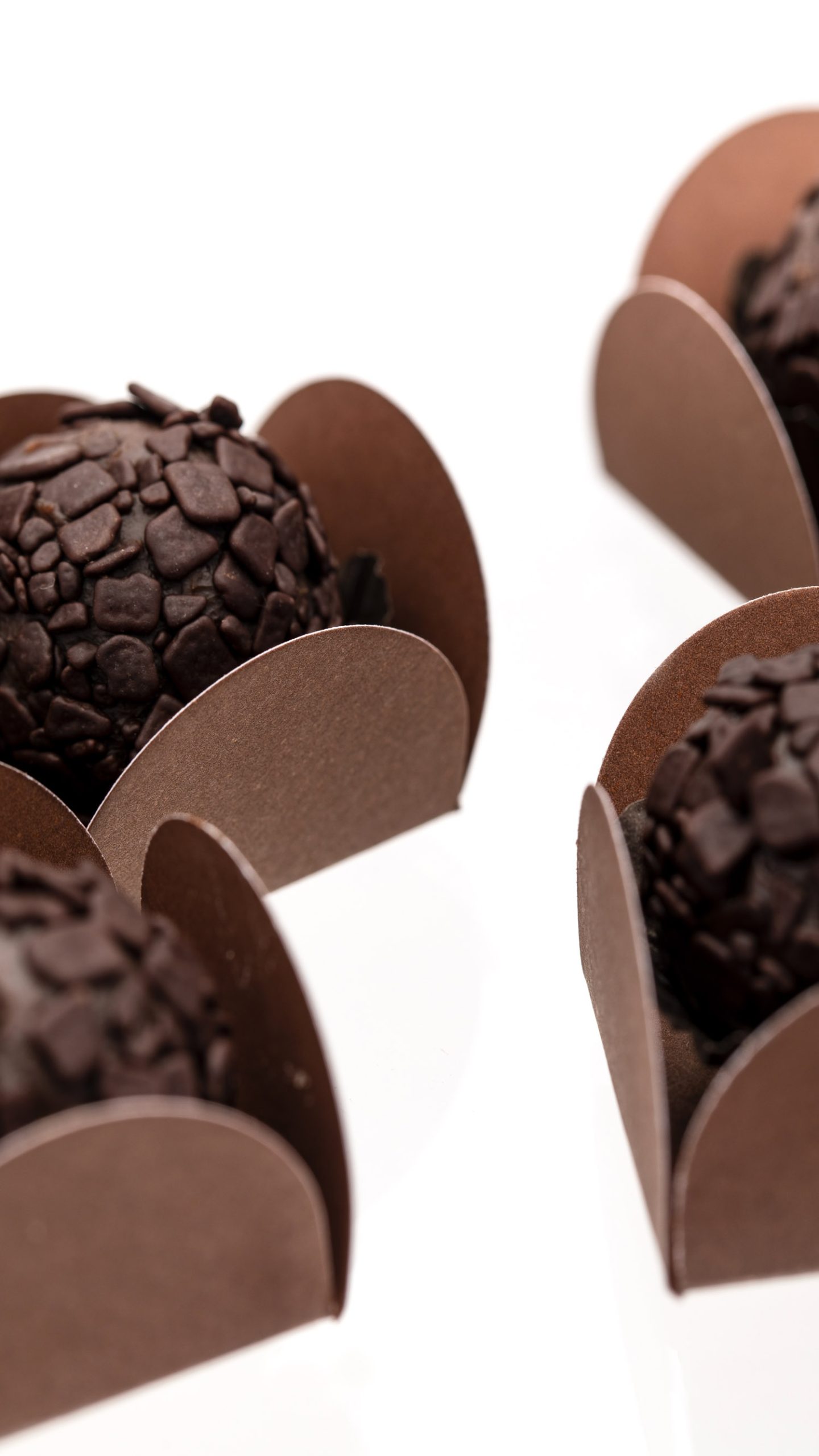 • Gourmet Dark Chocolate Brigadeiro  celebrated for its deep, rich dark chocolate flavour. This brigadeiro achieves a smooth, velvety consistency with an intense chocolate taste.