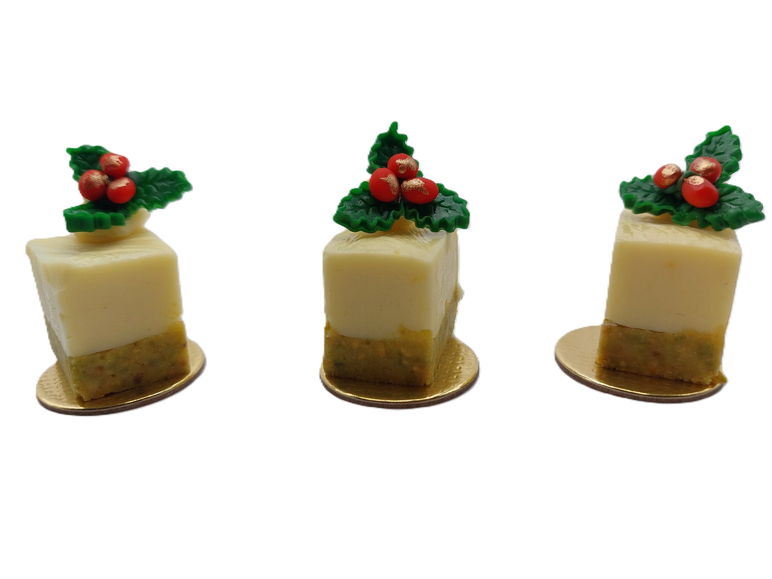 Celebrate the season with our Mini Pistachio & Lemon Ganache Treat, a luxurious dessert that perfectly balances  pistachio base flavours with the zesty brightness of lemon ganache. The delicate base is crafted with premium pistachios, topped with a silky, citrus-infused ganache for a refreshing finish. Adorned with charming holiday-themed decorations.